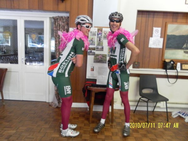 Due to Doug's disappointment at the lack of ladies entering the Nev Crane Event, Boston Wheelers came up with a "solution". Alan Sharpe and Steve Blackburn pledged £20 each if Asa Elkington and Darren Smith would ride the race dressed as "Ladies". The money to go to our Charity of the Year.