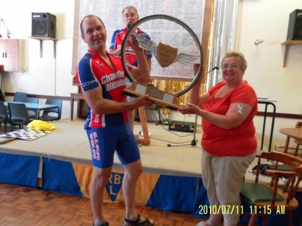 Ian Pike recieving the Nev Crane Trophy with a time of 59-47 |