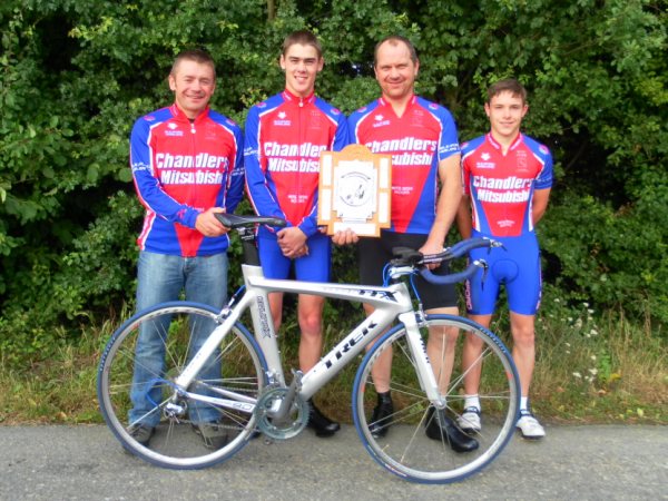 The Nev Crane Memorial Time Trial (click for more) Nev's widow Jean presented the Trophy to the Memorial Event. It is presented each year to the quickest rider from the Sleaford Wheelers. The first rider to put his name on it was Mark Colclough. In 2008 it changed hands when Jim Boyle put in a sterling performance to take 2nd place from 105 riders. 2009 and it was all change again with Mark regaining the Trophy. |