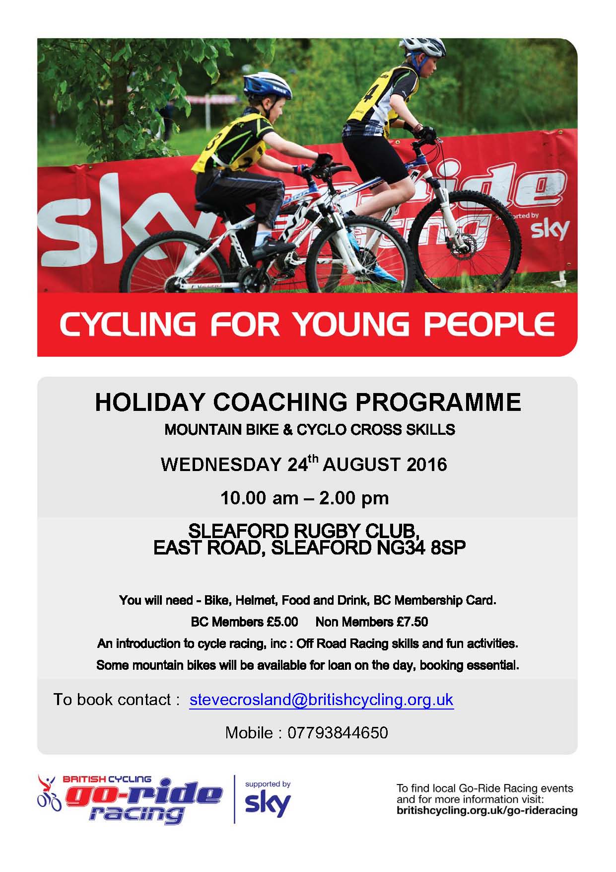 Go-Ride is British Cycling's development programme for young people. The programme provides a fun and safe way to introduce young riders to the world of cycle sport and provides a platform to improve bike handling skills. Go-Ride provides the first step onto the Performance Pathway - over 60% of riders on the Great Britain Cycling Team started out at Go-Ride Clubs. Sleaford Go-Ride club meets at 6:30pm every Tuesday evening at Sleaford Rugby Club. British Cycling coaches are running the club for the first several weeks and then our club coaches will take over.